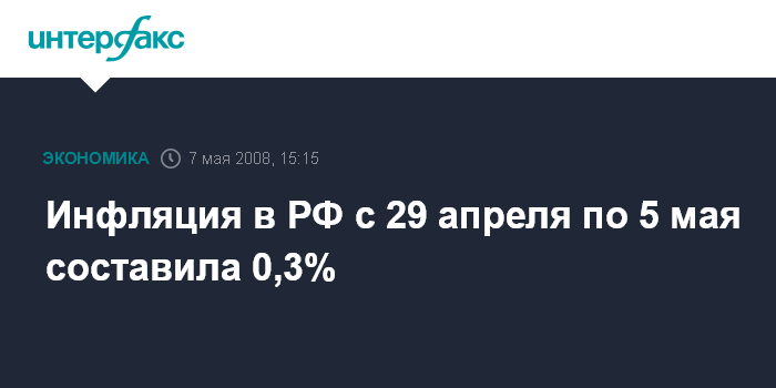 Москва. 7 мая. INTERFAX.RU - Инфляция в РФ с 29 апреля по 5 мая составила 0,3%, сообщил "Интерфаксу" источник в одном из ведомств. Рост потребительских цен с начала мая составил 0,2%.