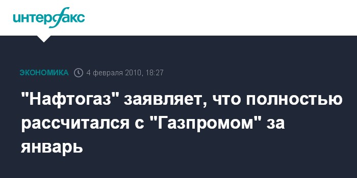 Киев. 4 февраля. INTERFAX.RU - Национальная акционерная компания "Нафтогаз Украины" своевременно и в полном объеме рассчиталась за поставленный в январе природный газ перед российским ОАО "Газпром", сообщили агентству в пресс-центре украинского холдинга.
