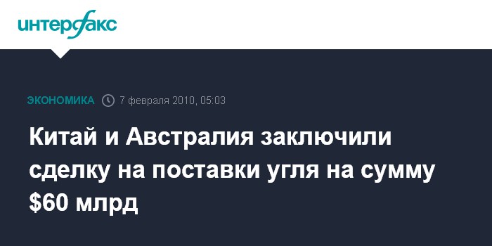 Пекин. 7 февраля. ИНТЕРФАКС-КИТАЙ - Китайская электрическая компания China Power International Development Ltd.,CPI и австралийская Resourcehouse Ltd заключили контракт на поставки из Австралии в Китай каменного угля на сумму $60 млрд, сообщили китайские СМИ.