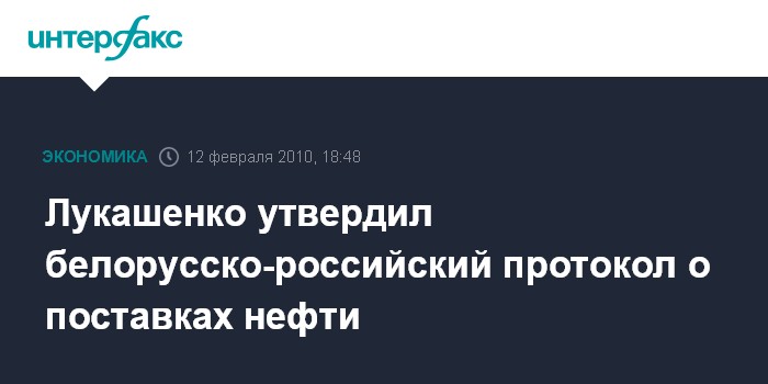 Минск. 12 февраля. INTERFAX.RU - Президент Белоруссии Александр Лукашенко своим указом в пятницу утвердил белорусско-российский межправительственный протокол об условиях поставки нефти в Белоруссию и ее транзита через территорию республики в 2010 г., сообщили агентству "Интерфакс" в пресс-службе главы государства.