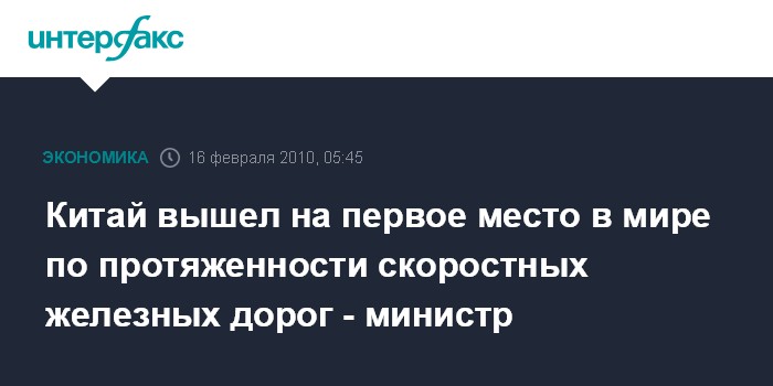 Пекин. 16 февраля. ИНТЕРФАКС-КИТАЙ - По состоянию на конец 2009 года Китай вышел на первое место в мире по общей протяженности и технической оснащенности скоростных железных дорог, заявил министр железных дорог КНР Лю Чжицзюнь, сообщает во вторник официальный сайт ведомства.