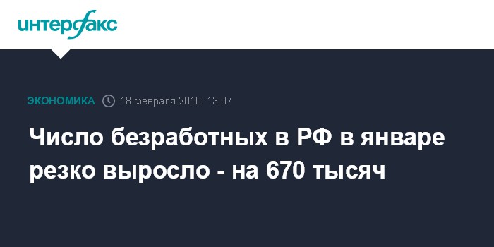Москва. 18 февраля. INTERFAX.RU – Общая численность безработных в России в январе 2010 года увеличилась к декабрю на 668 тысяч человек и составила 6,841 миллиона человек, сообщила в четверг Федеральная служба государственной статистики (Росстат).