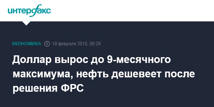 Москва. 19 февраля. INTERFAX.RU – Неожиданное повышение Федеральной резервной системой (ФРС) процентной ставки, по которой банки могут брать кредиты у ЦБ через дисконтное окно, вызвало снижение акций и цен на нефть, курс доллара вырос до 9-месячного максимума.