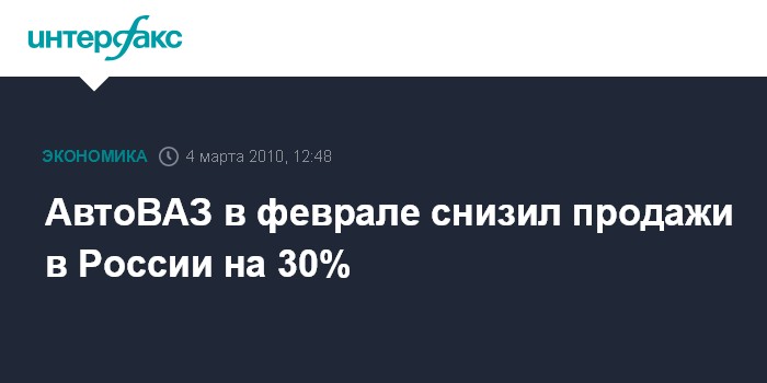 Москва. 4 марта. INTERFAX.RU - ОАО "АвтоВАЗ", согласно предварительным данным, реализовало в феврале в России чуть более 20 тыс. автомобилей, что на 30% меньше показателя февраля 2009 года, говорится в сообщении аналитиков "Автостата".