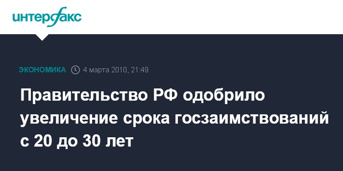 Москва. 4 марта. INTERFAX.RU - Правительство РФ на заседании в четверг одобрило поправки в закон "О федеральном бюджете на 2010 год и плановый период 2011-2012 годов", предусматривающие увеличение срока государственных заимствований с 20 лет до 30 лет, сообщил агентству "Интерфакс-АФИ" замминистра финансов РФ Дмитрий Панкин. Таким образом, уже в этом году Россия сможет выпускать 30-летние облигации.