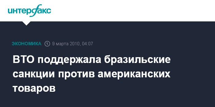 Москва. 9 марта. ИНТЕРФАКС - Всемирная торговая организация (ВТО) одобрила решение правительства Бразилии, которое объявило о введении торговых санкций в отношении ряда американских товаров.