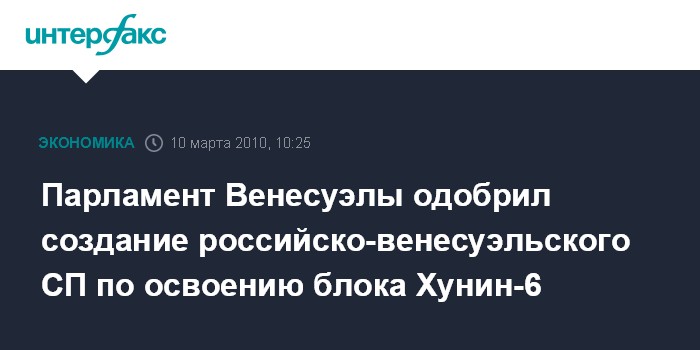 Москва. 10 марта. INTERFAX.RU – Национальная ассамблея Венесуэлы одобрила создание совместного предприятия между Petroleos de Venezuela SA (PdVSA) и российским Национальным нефтяным консорциумом (ННК) по освоению блока Хунин-6, говорится в сообщении на сайте парламента Венесуэлы.