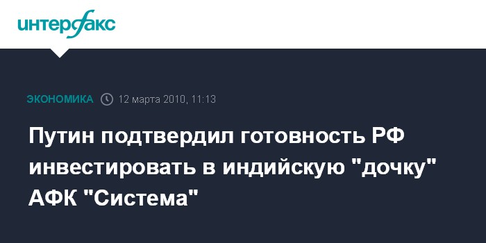 Путин подтвердил готовность РФ инвестировать в индийскую "дочку" АФК "Система"