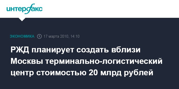 Москва. 17 марта. INTERFAX.RU - ОАО "Российские железные дороги" планирует создать в районе Москвы терминально-логистический центр ориентировочной стоимостью 20 млрд рублей, сообщил президент компании Владимир Якунин, выступая с лекцией перед студентами Высшей школы менеджмента в Петербурге в среду. По его словам, центр будет включать складские мощности, цеха по подготовке товаров для нужд РЖД, административный центр, а также контейнерный терминал мощностью 290 тыс. TEU (эквивалент 20-футового контейнера) в год. При этом Якунин отметил, что 20 млрд рублей - это стоимость проекта на сегодняшний день, она может меняться в ходе его реализации. Глава РЖД не уточнил сроки реализации проекта, отметив, что его окупаемость составит 3-5 лет.