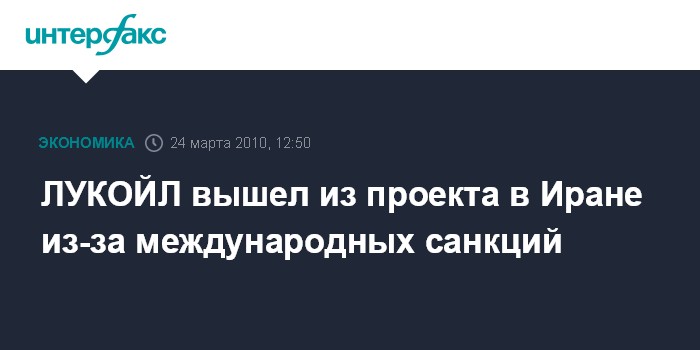 Москва. 24 марта. INTERFAX.RU - НК "ЛУКОЙЛ" вышла из проекта Анаран в Иране из-за международных санкций, говорится в сообщении компании. Как говорится в отчете, группа признала убыток от обесценения инвестиций в Иране в сумме $63 млн "в связи с невозможностью осуществления дальнейших работ на месторождении из-за наличия экономических санкций со стороны правительства США".