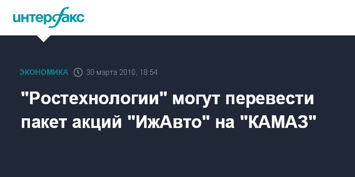 Ижевск/Москва. 30 марта. INTERFAX.RU - ГК "Ростехнологии" может передать акции ОАО "ИжАвто" с ОАО "Ижевский машиностроительный завод" ("Ижмаш", Удмуртия) ОАО "КАМАЗ" в рамках формирования единого холдинга "Росавто", в который планируется внести пакеты ГК в "АвтоВАЗе", "КАМАЗе" и ряде других предприятий, сообщил "Интерфаксу" источник в автомобилестроительной отрасли.