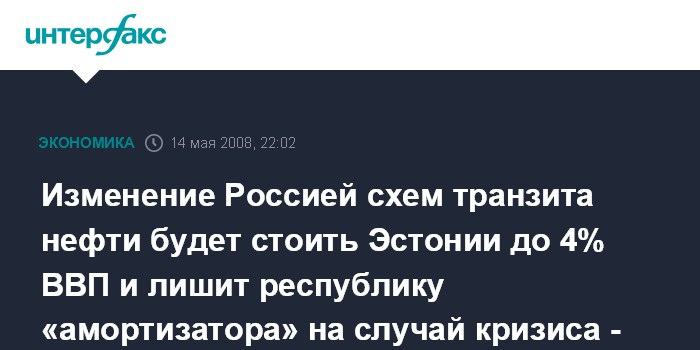 "После апрельских событий 2007 года, связанных с переносом Бронзового солдата, Эстония уже потеряла примерно 40% российского транзита, или 8-10 миллиардов крон, что составляет 3-4% от ВВП", - отметил он в среду в интервью "Интерфаксу".