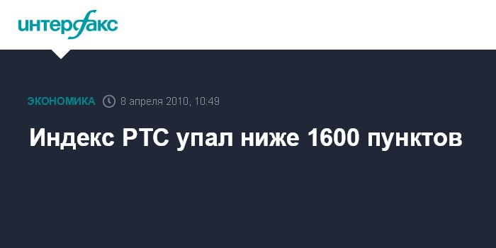 Москва. 8 апреля. INTERFAX.RU - Индекс РТС, один из основных российских фондовых индикаторов, утром в четверг скатился ниже отметки 1600 пунктов, выше которой находился с начала текущего месяца. К 10:43 МСК индекс РТС составил 1599,83 пункта (-0,87%).