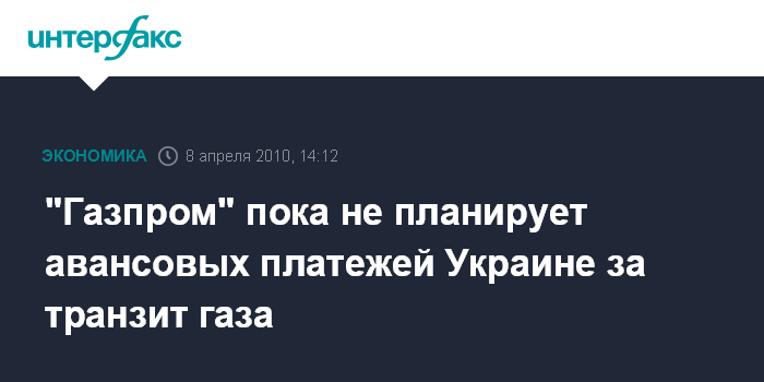 Москва. 8 апреля. INTERFAX.RU - "Газпром" пока не планирует авансовых платежей Украине за транзит газа, сообщил Агентству газовой информации (АГИ) заместитель председателя правления "Газпрома" Валерий Голубев. Отвечая на вопрос, действительно ли "Газпром" осуществил Украине авансовый платеж за транзит российского газа в Европу, он сказал: "Мы заплатили за транзит в марте. За апрель пока не платили. У нас нет взаимных долгов".