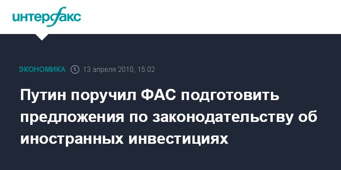 Москва. 13 апреля. INTERFAX.RU - Премьер-министр РФ Владимир Путин поручил Федеральной антимонопольной службе (ФАС) в максимально сжатые сроки представить предложения по совершенствованию законодательства об иностранных инвестициях. Такое поручение Путин дал, открывая заседание правительственной комиссии по контролю за осуществлением иностранных инвестиций в РФ. По его словам, "правительство ведет сейчас активную работу по формированию благоприятной среды для бизнеса, уже принято решение по устранению многих избыточных административных барьеров, развитию конкуренции".