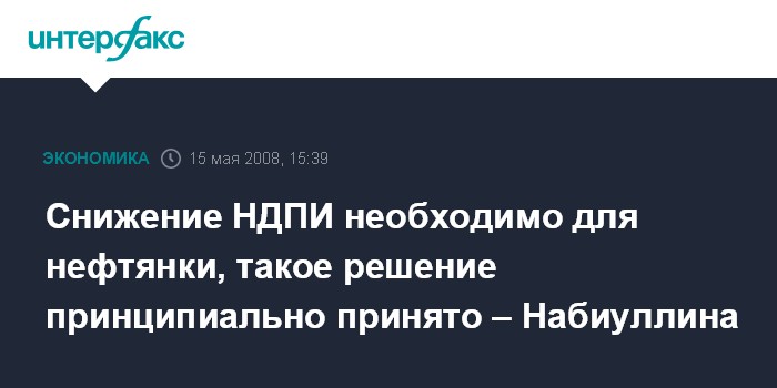 Москва. 15 мая. INTERFAX.RU - Снижение налога на добычу полезных ископаемых (НДПИ) необходимо для развития российской нефтяной отрасли, заявила глава Минэкономразвития Эльвира Набиуллина на брифинге по итогам заседания правительства.