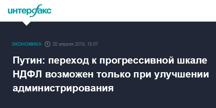 Москва. 20 апреля. INTERFAX.RU - Переход к прогрессивной шкале ставки НДФЛ возможен только при улучшении налогового администрирования, считает премьер-министр Владимир Путин. "Во многих странах это (прогрессивная шкала НДФЛ - ИФ) работает, там где могут администрировать. А у нас, когда ввели 13% (единую ставку НДФЛ - ИФ), повысилась собираемость, потому что перестали прятать", - сказал Путин, отвечая на вопросы депутатов во вторник.