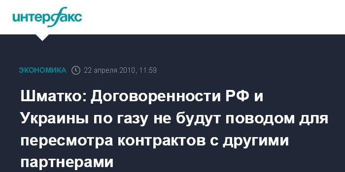 Москва. 6 июля. INTERFAX.RU – Договоренности России и Украины по газу не будут поводом для пересмотра аналогичных контрактов с другими партнерами РФ, в том числе в СНГ, сообщил журналистам министр энергетики РФ Сергей Шматко.