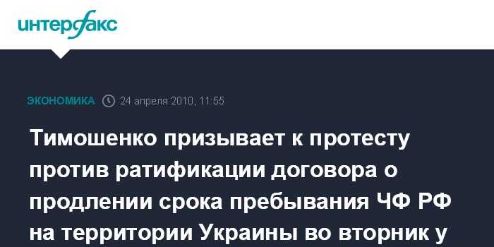 Москва. 24 апреля. INTERFAX.RU - Лидер БЮТ Юлия Тимошенко призывает сторонников оппозиционных сил прийти во вторник к зданию парламента протестовать против ратификации договора о продлении срока пребывания Черноморского флота Российской Федерации на территории Украины.