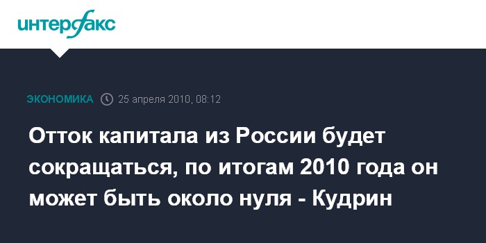 Отток капитала из России будет сокращаться, по итогам 2010 года он может быть около нуля - Кудрин