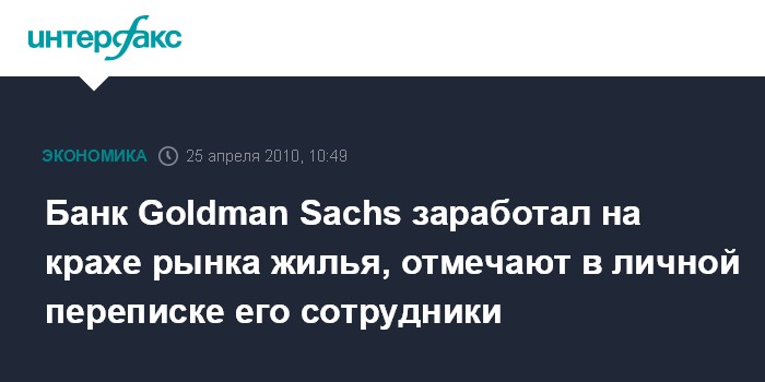 Банк Goldman Sachs заработал на крахе рынка жилья, отмечают в личной переписке его сотрудники