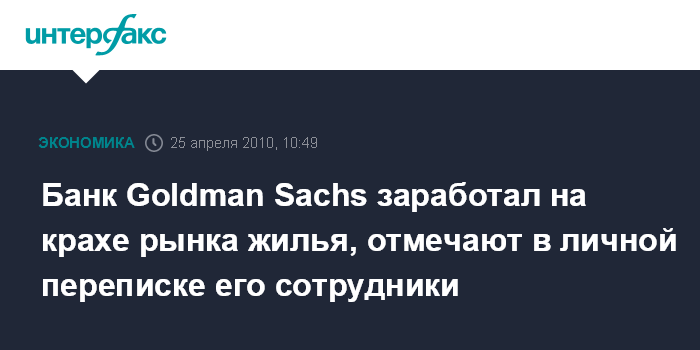 Лондон. 25 апреля. INTERFAX.RU - В США обнародована электронная переписка топ-менеджеров банка Goldman Sachs, в которой они хвалились прибылью, полученной компанией в период краха рынка жилья в 2007 году, сообщает Би-би-си в воскресенье. Электронная переписка была обнародована постоянным подкомитетом Сената, занимающимся расследованием причин финансового кризиса, в преддверии слушаний, которые состоятся во вторник.