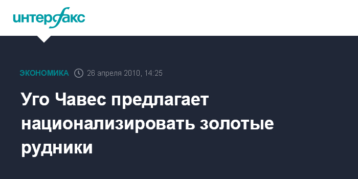 Москва. 26 апреля. INTERFAX.RU - Президент Венесуэлы Уго Чавес объявил о возможном аннулировании концессий на разработку месторождений золота и последующей национализации рудников.