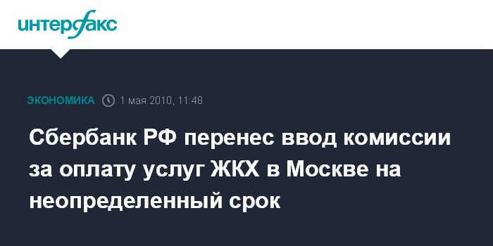 Москва. 1 мая. INTERFAX.RU - Сбербанк России принял решение перенести на неопределенный срок введение комиссии с граждан РФ за оплату услуг ЖКХ в Москве, сообщили агентству "Интерфакс" в субботу в пресс-службе банка.