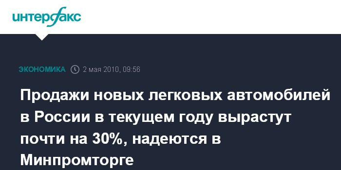 Москва. 2 мая. ИНТЕРФАКС - Объем продаж новых легковых автомобилей в РФ по итогам 2010 года может составить 1,8 млн штук, что на 29% больше уровня 2009 года (1,4 млн штук).