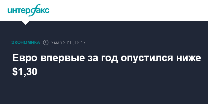 Москва. 5 мая. INTERFAX.RU - Курс евро в среду продолжил снижение и впервые с апреля прошлого года упал ниже $1,30 на фоне нервозности инвесторов по поводу возможности дальнейшего разрастания греческого долгового кризиса.