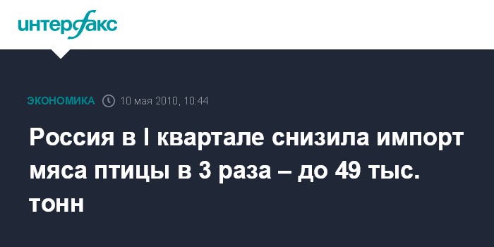 Москва. 10 мая. INTERFAX.RU - Россия в первом квартале 2010 года снизила импорт мяса птицы в три раза - до 49 тыс. тонн (на $69,5 млн) против 147,4 тыс. тонн ($158,7 млн) за аналогичный период 2009 года, сообщает ФТС. Резкое снижение эксперты мясного рынка объясняют прекращением поставок курятины, главным образом, из США в связи с "хлорной проблемой".
