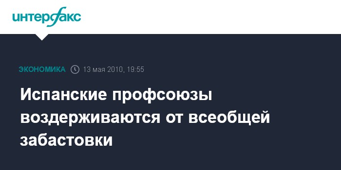 Мадрид. 13 мая. INTERFAX.RU - Руководители крупнейших испанских профсоюзов объявили в четверг, что пока не будут организовывать всеобщую забастовку.