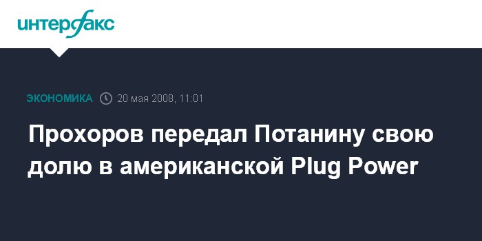 Москва. 20 мая. INTERFAX.RU - Президент фонда "Онэксим" Михаил Прохоров передал своему бывшему партнеру по холдингу "Интеррос" Владимиру Потанину долю в американской Plug Power, разрабатывающей топливные элементы и экологически чистые энергетические продукты.