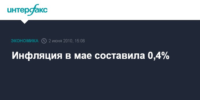 Москва. 2 июня. INTERFAX.RU – За период с 25 по 31 мая 2010 г. инфляция составила 0,1%, за май - 0,4%, с начала года - 3,9%, свидетельствуют данные Федеральной службы госстатистики (Росстата). На предыдущей неделе (с 18 по 24 мая) мая) цены также выросли на 0,1%.