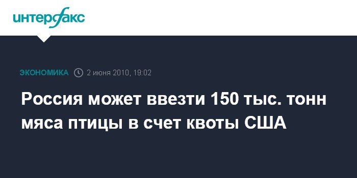 Подкомиссия по таможенно-тарифному регулированию и нетарифному регулированию, защитным мерам во внешней торговле правительственной комиссии по экономическому развитию и интеграции одобрила предложение Минэкономразвития и Минсельхоза РФ о возможности ввоза 150 тыс. тонн мяса птицы из любого другого государства-поставщика в счет объема тарифной квоты США на 2010 год. Это составляет 25% американской квоты, уточняется в сообщении.