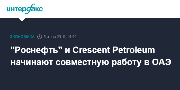 Москва. 5 июня. INTERFAX.RU - Торжественные мероприятия, посвященные началу работ по проекту освоения перспективного участка, который совместно реализуют ОАО "НК "Роснефть" и компания Crescent Petroleum Company International Limited (ОАЭ), состоялись в Шардже (Объединtнные Арабские Эмираты). В торгово-промышленной палате Шарджи было сделано официальное объявление о вступлении в силу прав "Роснефти" на долевое участие в проекте освоения наземного концессионного участка Crescent Petroleum, сообщили "Интерфаксу" в управлении информации ОАО "НК "Роснефть"