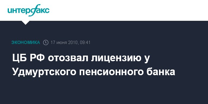 Москва. 17 июня. INTERFAX.RU - ЦБ РФ отозвал лицензию на осуществление банковских операций у кредитной организации ОАО "Удмуртский Пенсионный банк" (УП-банк, Ижевск), говорится в сообщении департамента внешних и общественных связей ЦБ РФ. Лицензия отозвана в связи с неисполнением федеральных законов, регулирующих банковскую деятельность, и нормативных актов Банка России, установлением фактов существенной недостоверности отчетных данных, а также учитывая неоднократное применение в течение одного года мер, предусмотренных законом "О Центральном банке РФ".