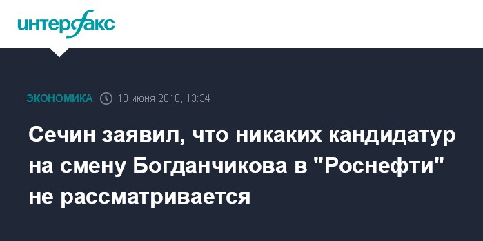 Москва. 18 июня. INTERFAX.RU - Вице-премьер РФ Игорь Сечин заявил, что никаких кандидатур на смену главы "Роснефти" Сергея Богданчикова не рассматривается.