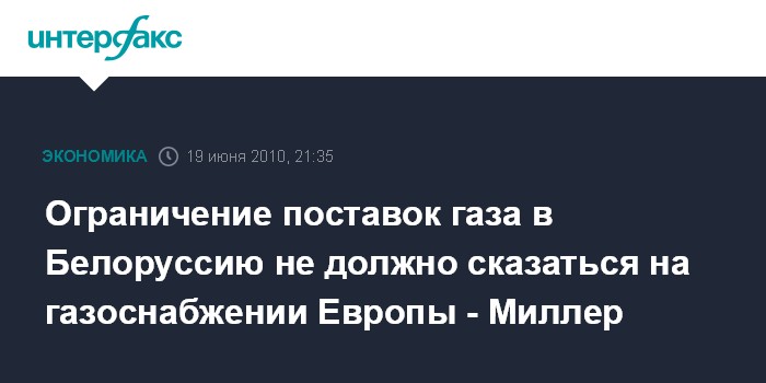 Санкт-Петербург. 19 июня. ИНТЕРФАКС-АГИ - Возможное ограничение поставок газа в Белоруссию, которое "Газпром" (РТС: GAZP) может осуществить с понедельника в случае неоплаты "Белтрансгазом" долга за газ, не должно сказаться на газоснабжении Европы, заявил журналистам глава "Газпрома" Алексей Миллер.