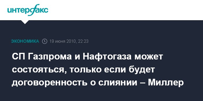 Санкт-Петербург. 19 июня. ИНТЕРФАКС-АГИ - Совместное предприятие "Газпрома" (РТС: GAZP) и "Нафтогаза Украины" может быть создано лишь в случае, если будет достигнута договоренность о втором этапе - слиянии "Газпрома" и "Нафтогаза", заявил глава "Газпрома" Алексей Миллер журналистам в субботу.