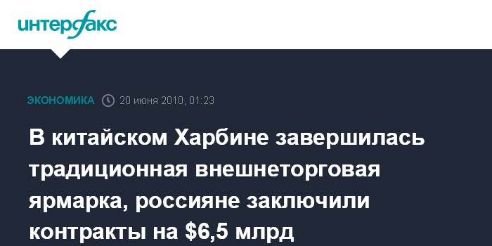 Пекин. 20 июня. ИНТЕРФАКС - На завершившейся в субботу в городе Харбине традиционной торгово-экономической ярмарке российские участники подписали с китайскими партнерами контракты на общую сумму $6,5 млрд, сообщили агентству "Интерфакс" в торгпредстве РФ в КНР.