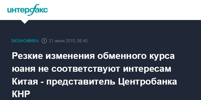 Пекин. 21 июня. ИНТЕРФАКС-КИТАЙ - Резкие изменения обменного курса китайского юная противоречат интересам страны, заявил официальный представитель Народного банка Китая (НБК, китайский Центробанк - ИФ).
