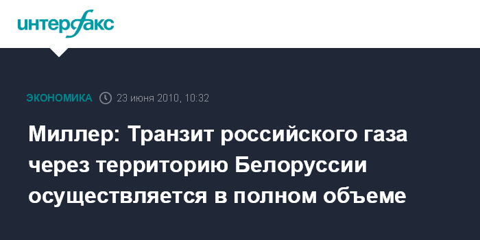 Москва. 23 июня. INTERFAX.RU - Транзит российского газа через Белоруссию осуществляется бесперебойно, сообщил председатель правления российской газовой компании Алексей Миллер.