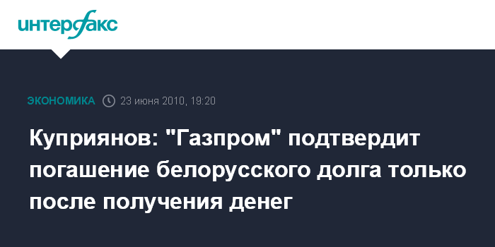 Москва. 23 июня. INTERFAX.RU - "Газпром" подтвердит погашение белорусского долга только после получения денег, сообщил представитель компании Сергей Куприянов. "Мы подтвердим погашение долга только после получения денег. Денег на счете нет", - сказал Куприянов Агентству газовой информации.