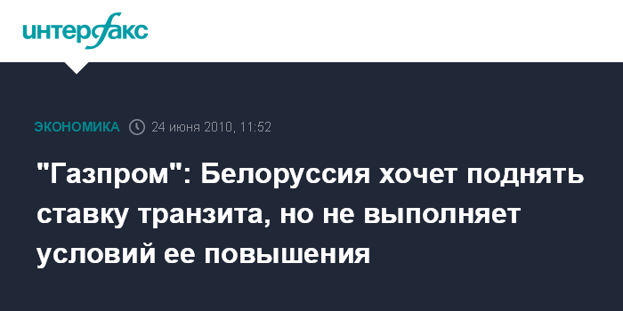 Москва. 24 июня. INTERFAX.RU - Белоруссия хочет поднять ставку транзита, но не выполняет условий ее повышения, сказал журналистам официальный представитель "Газпрома" Сергей Куприянов. Он пояснил, что в контракте предусмотрена базовая ставка за транзит в размере $1,45 за тысячу кубометров на 100 км. При создании совместного предприятия на базе "Белтрансгаза" была предусмотрена возможность увеличения размера ставки до $1,74 в 2009 г. и $1,88 в 2010 году. Однако этот вопрос был увязан с увеличением оптовой надбавки на газ, реализуемый "Белтрансгазом" на местном рынке в размере $10,47 на тысячу кубометров в 2009 г. и $11,08 в 2010 году. Однако эта надбавка не была введена.
