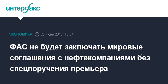 Москва. 25 июня. INTERFAX.RU - Федеральная антимонопольная служба РФ не будет заключать мировые соглашения по штрафам за злоупотребление ценами на нефтепродукты 4 крупнейшими нефтяными компаниями без специального поручения премьер-министра РФ, заявил журналистам в пятницу глава ФАС Игорь Артемьев. "Мы приняли решение не заключать мировые соглашения, если не будет специального поручения премьер-министра Владимира Путина. Пока их нет, и они не ожидаются", - сказал он.