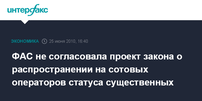 Москва. 25 июня. INTERFAX.RU - Федеральная антимонопольная служба (ФАС) не согласовала проект закона, позволяющий распространить на компании мобильной связи статус существенных операторов.