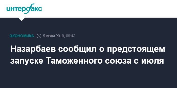 Москва. 5 июля. INTERFAX.RU - Россия, Белоруссия и Казахстан подпишут в понедельник в Астане документ о запуске с июля Таможенного союза, сообщил президент Казахстана Нурсултан Назарбаев.