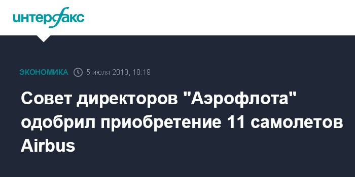 Москва. 5 июля. INTERFAX.RU - Совет директоров ОАО "Аэрофлот-российские авиалинии" одобрил приобретение 11 самолетов Airbus 330-300 с поставками в 2011 - 2013 гг., говорится в сообщении компании.