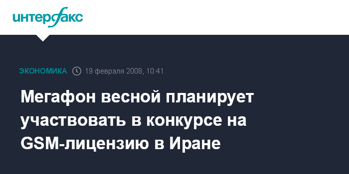 Москва. 19 февраля. INTERFAX.RU - ОАО "Мегафон" планирует участвовать в конкурсе на получение лицензии для оказания услуг мобильной связи в стандарте GSM в Иране, сообщила "Интерфаксу" корпоративный секретарь компании Анна Горяинова.